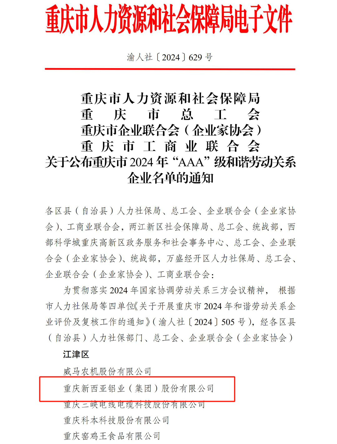 2024年12月31日,重慶市人力資源和社會保障局、重慶市總工會、重慶市企業聯合會(企業家協會)、重慶市工商業聯合會發布了重慶市2024年度“AAA”級和諧勞動關系企業名單,重慶新西亞鋁業(集團)股份有限公司憑借其健全的勞動用工管理體系及和諧的勞動關系,榮耀上榜!