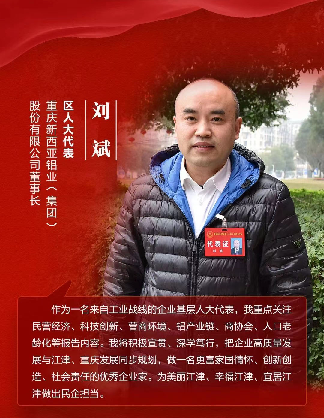 2025年1月10日,重慶市江津區(qū)人大常委會辦公室印發(fā)了《關于表揚2024年度優(yōu)秀基層區(qū)人大代表及代表優(yōu)秀建議的通報》,其中,重慶新西亞鋁業(yè)集團的董事長兼總經(jīng)理劉斌同志榮獲2024年度優(yōu)秀基層區(qū)人大代表的稱號。