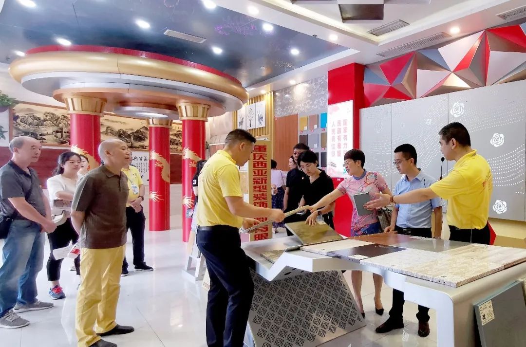 在參觀產品展廳時,鐘書記一行對西亞牌鋁單板在內裝、外裝方面的應用表現出濃厚的興趣,對西亞牌鋁單板表面處理工藝的豐富性,造型的獨特性大加贊賞;對依萊卡全鋁家居在環保健康、防水防潮、高保值可回收等方面的特性表示認可。