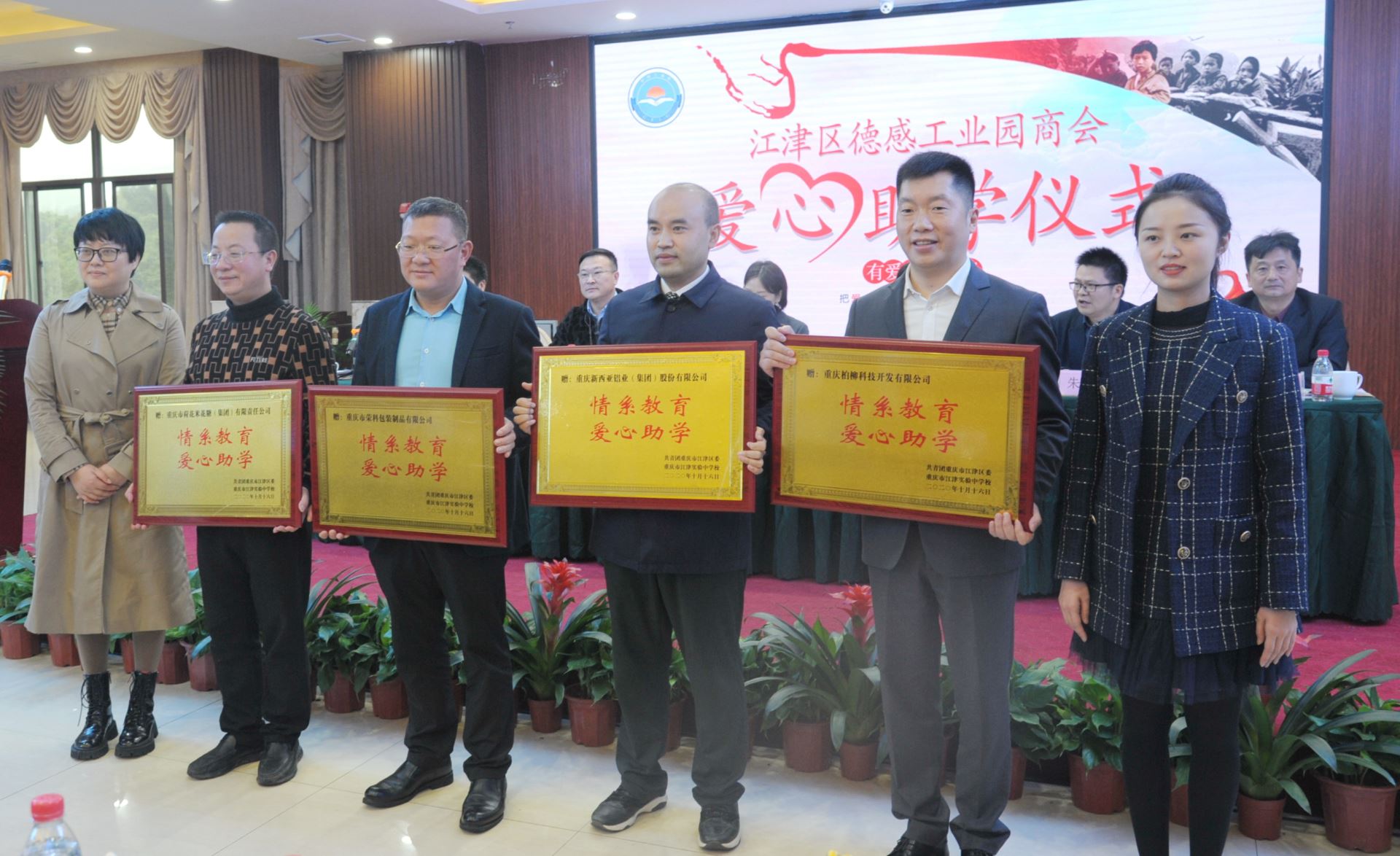 2020年10月16日,江津區德感工業園商會第三屆一次會員大會在禾宴大酒店隆重舉行,作為本次會議主要議程,會員企業—重慶市荷花米花糖(集團)有限公司、重慶市榮科包裝制品有限公司、重慶柏柳開發有限公司、重慶新西亞鋁業(集團)股份有限公司,共同出席了“愛心助學·情系教育”活動儀式。江津區委常委、區委統戰部部長楊利,江津區委常委、德感工業園發展中心黨委書記、主任李祖明,德感工業園發展中心黨委委員、副主任朱志明,江津區工商聯(總商會)主席鄒勇,江津區工商聯(總商會)副主席廖代旭、江津團區委副書記陳奕池、江津區實驗中學副校長柴瑛及德感商會92名會員共同見證了這一時刻。