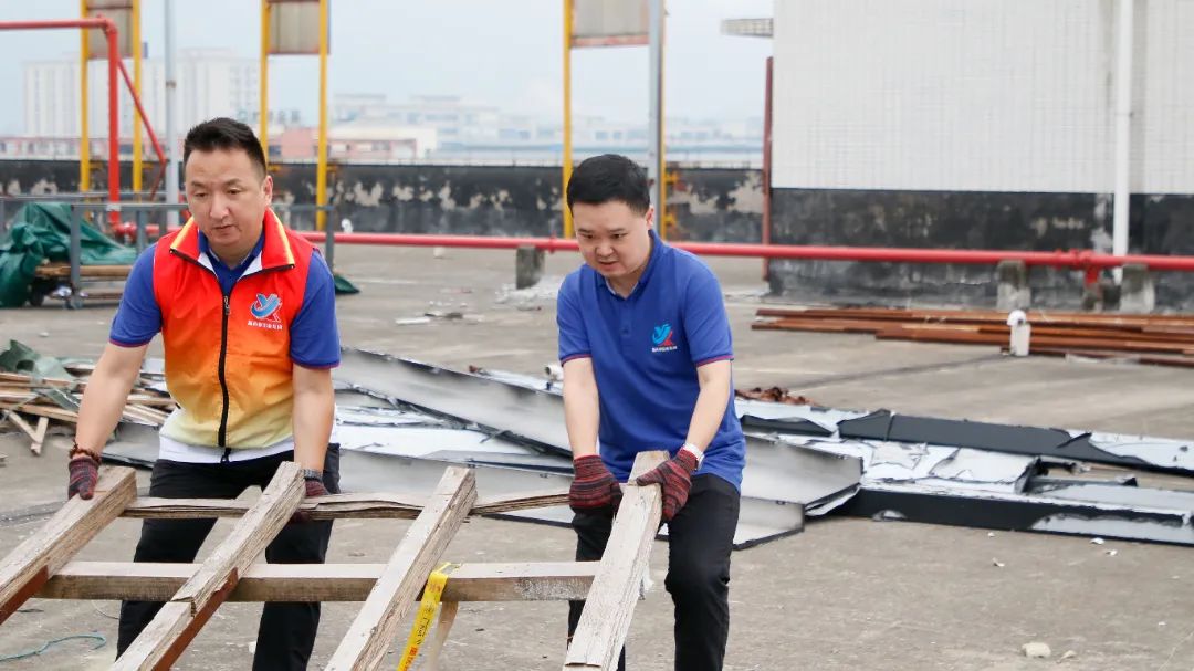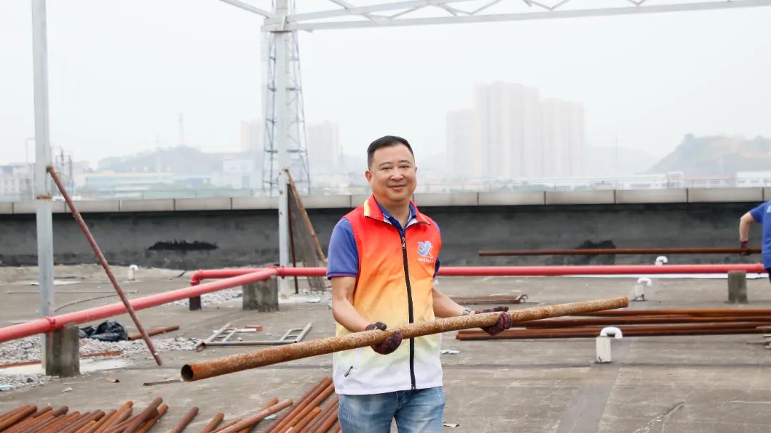 此次義務勞動內容是清理生產廠房樓頂施工區散亂堆放的鋼管、鋼架、管件、木條、石子等施工物料和垃圾,分類整齊堆放可用的物料,清運不可用的廢棄物料和垃圾,改善廠區風貌。