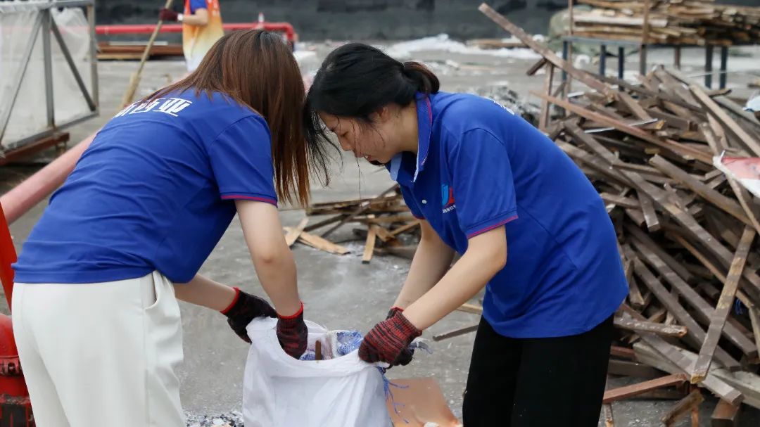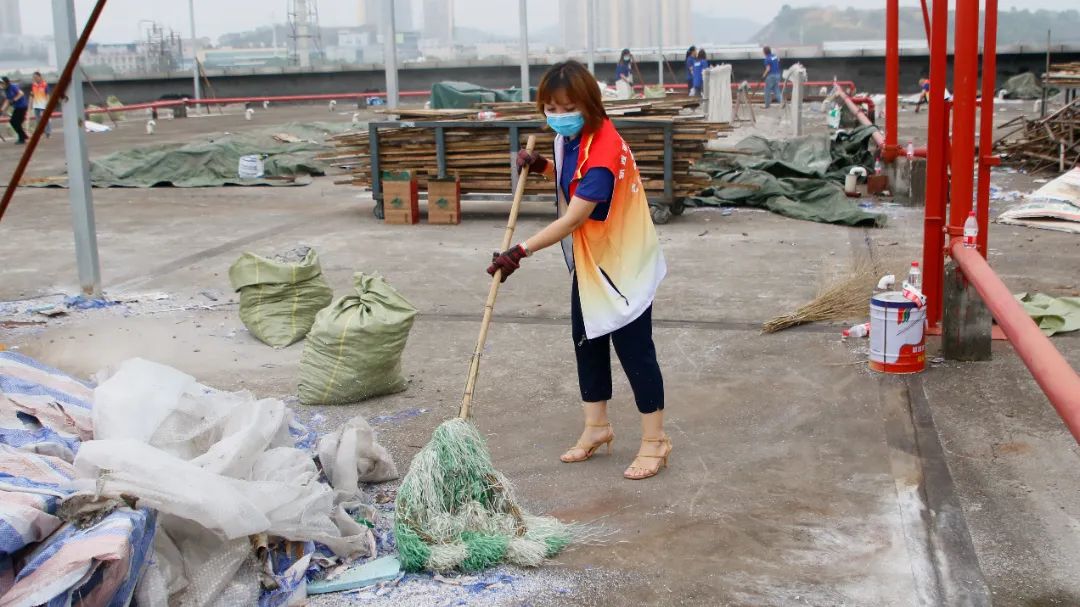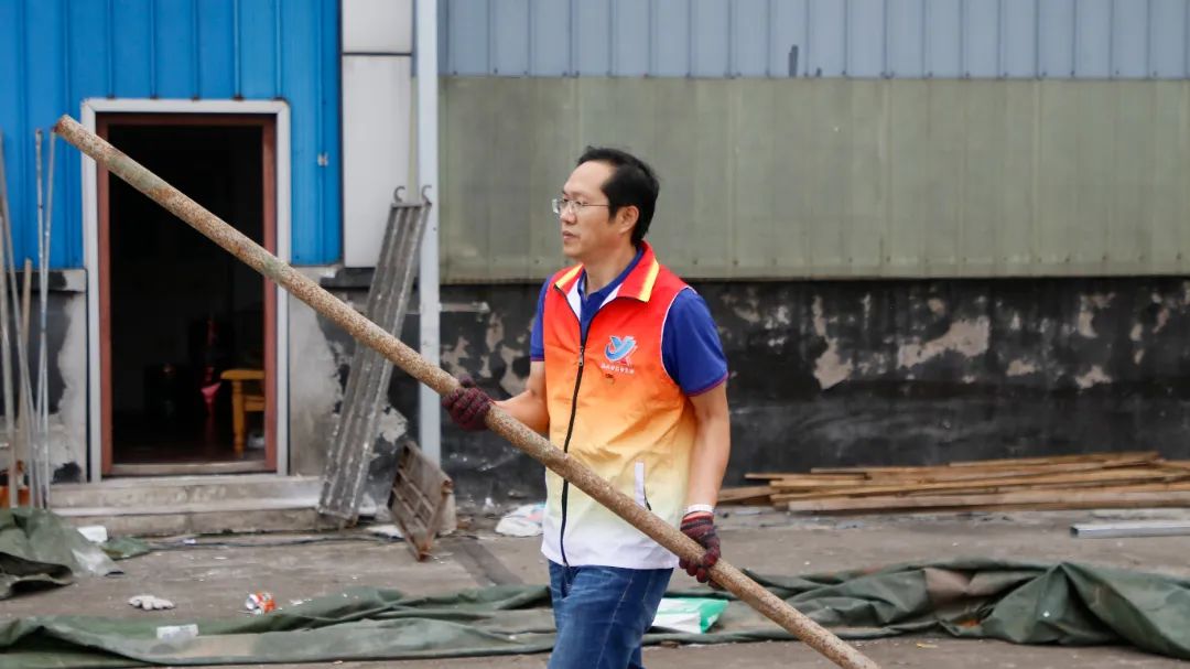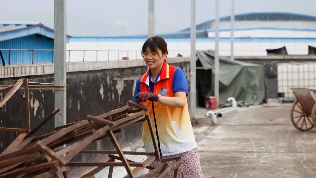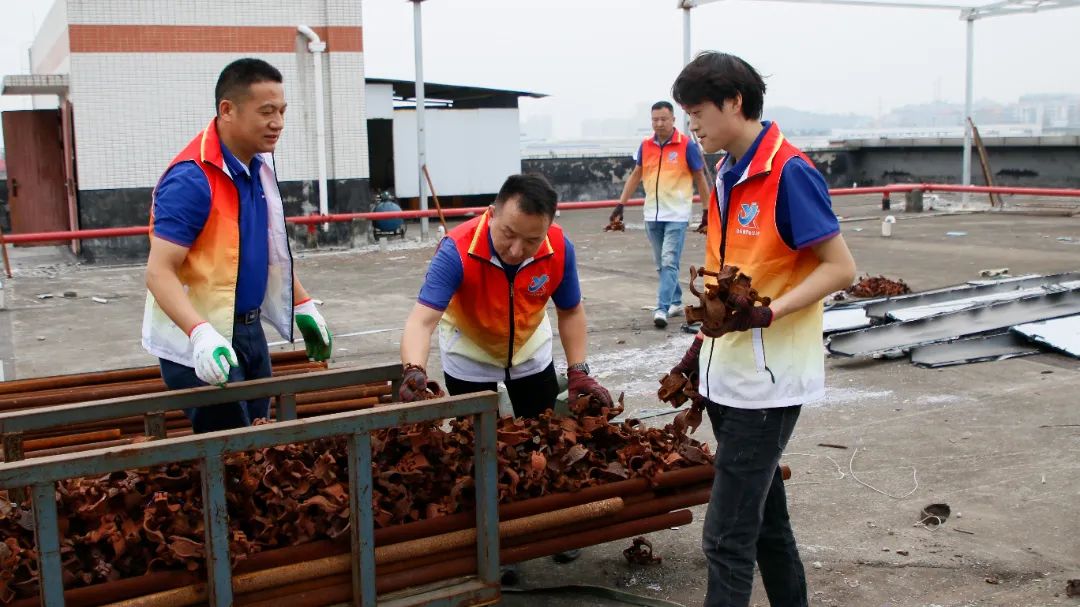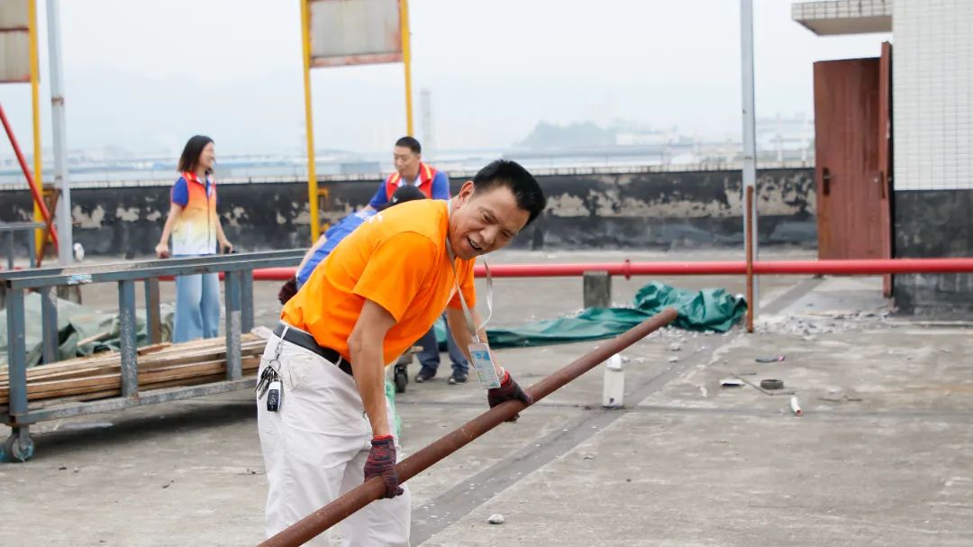 勞動中,大家忘記了自己的年齡、性別,個個不甘落后,搶著去干重活、臟活、累活……勞動的汗水浸濕了大家身上的衣裳,同時也換來了“收獲的喜悅”。經過近兩個半小時的辛勤勞動,讓原來雜亂的廠房頂樓煥然一新。