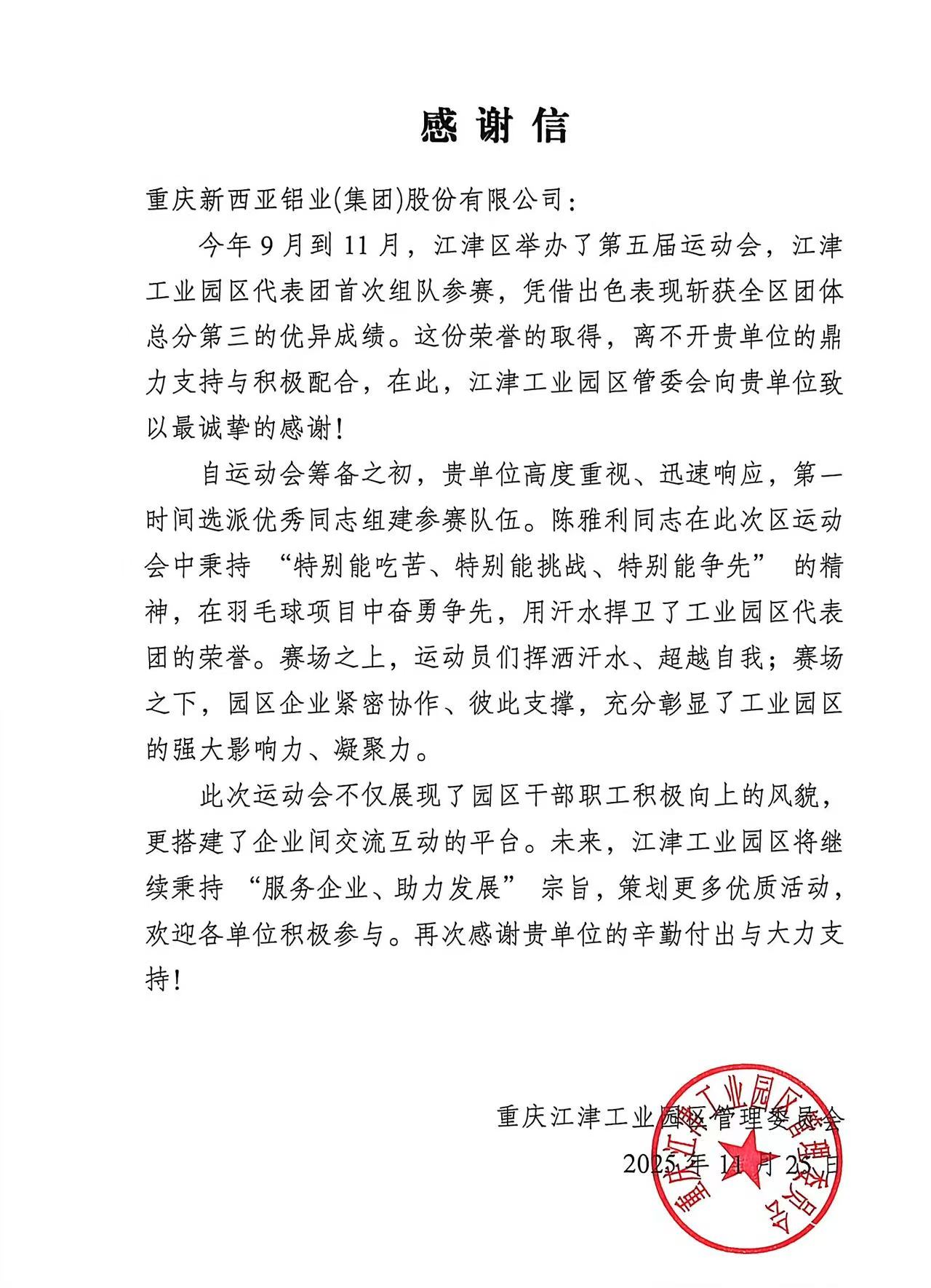 近日,一份來自重慶江津工業(yè)園區(qū)管理委員會的感謝信,讓新西亞鋁業(yè)全體同仁倍感振奮。信中,園區(qū)管委會對我司財務(wù)管理部陳雅利同志在第五屆區(qū)運會中的卓越表現(xiàn)給予了高度贊揚,并對我司的大力支持表示誠摯感謝。